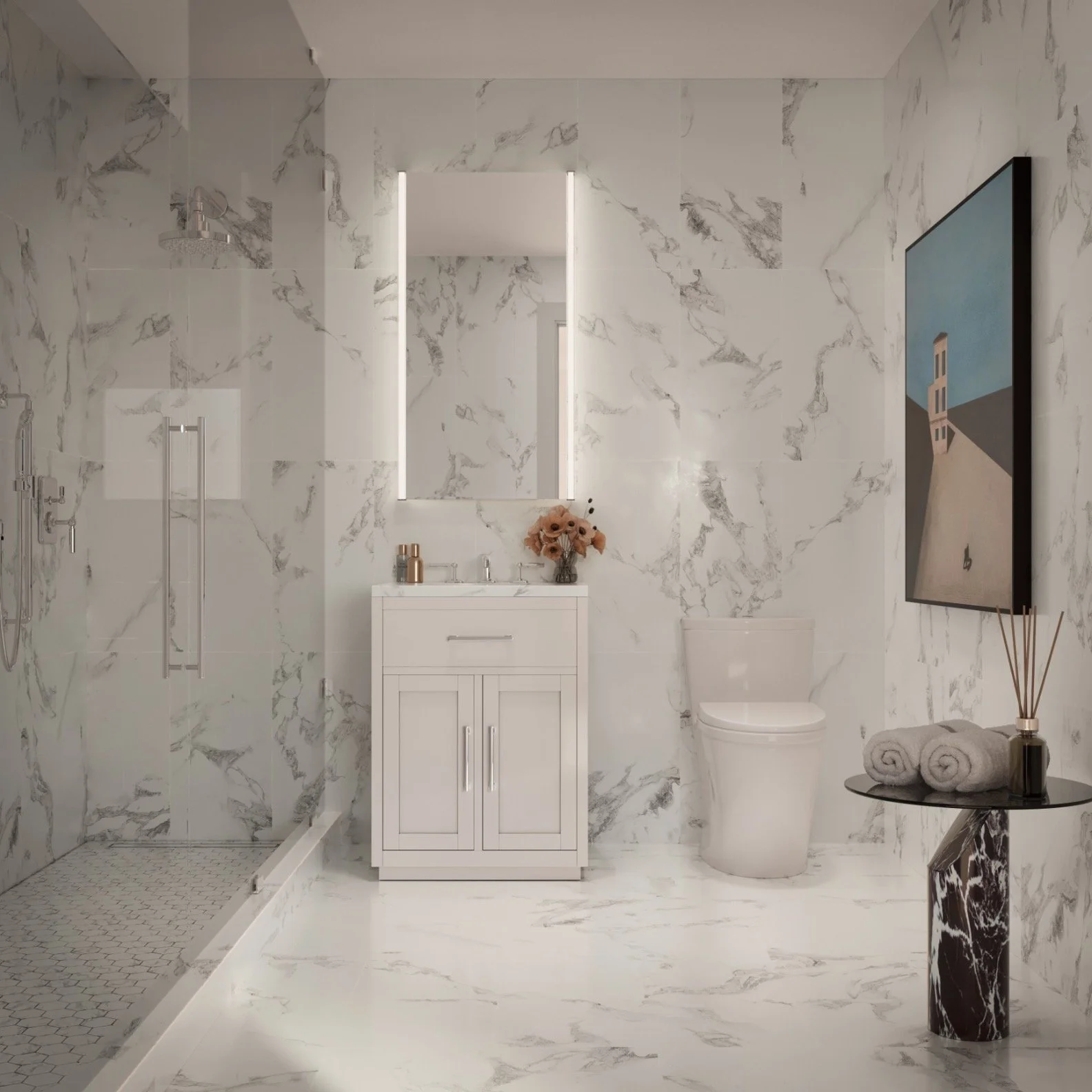 Wrapped in honed Bianco Carrara marble and grounded in enduring materials, the bathrooms offer a composed escape from the city. Clean architectural lines, custom fixtures, and tailored detailing create an atmosphere of quiet clarity.