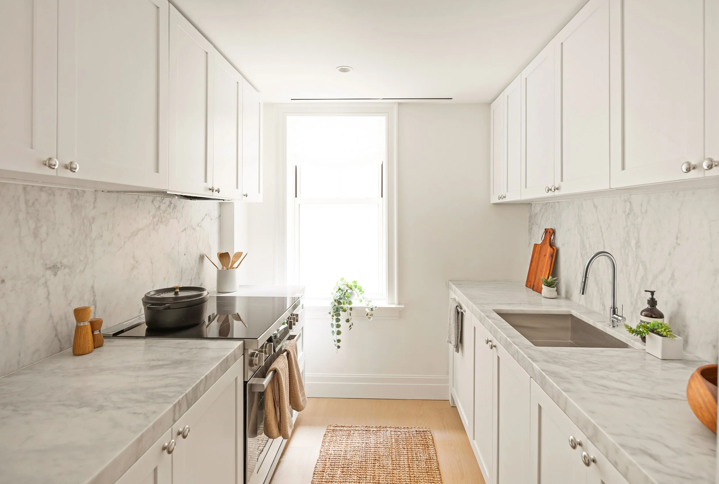 Framed by clean architectural lines and crafted in honed Bianco Carrara marble, the kitchens balance precision with warmth. Custom millwork, integrated Bosch appliances, and natural finishes create a space that feels tailored and inviting.From quiet mornings to evenings with friends, every detail is considered, elevating the everyday through thoughtful design.